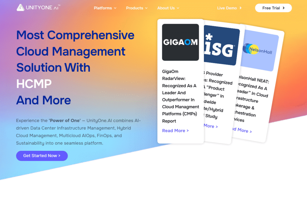 Founded in 2016, UnityOne AI™ is the most comprehensive cloud management platform built to unify and simplify enterprise multicloud operations. It consolidates DCIM, Multicloud AIOps, HCMP, FinOps, and GreenOps into a single unified control plane—what the company calls the Power of One.